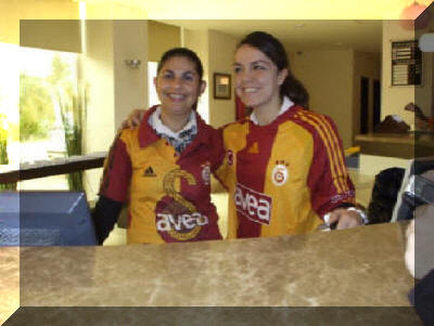 Empfangsdamen des Hotels Rose Residence in Kemer in den offiziellen Trikots von Galatasaray Istanbul |